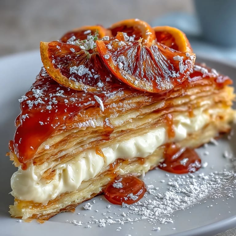 I made this for a winter dinner party when blood oranges were just starting to show up at the market, and I couldn't resist their deep ruby color. My kitchen smelled like citrus for hours, and when I finally sliced into the cake, the layers held perfectly. One guest asked if I'd trained in France, and I just laughed and told her about the store-bought crêpes hidden in my fridge. Sometimes the smartest cooking is knowing when to let someone else do the hard part.
