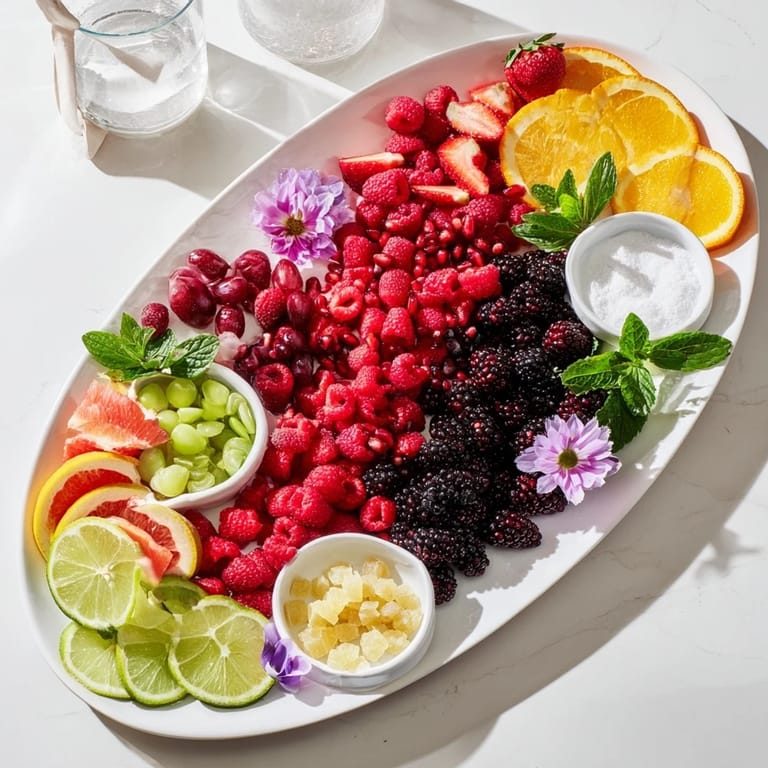 Prepare the fruits and herbs with care to ensure they are completely dry; this helps maintain freshness and prevents any dilution of the sparkling drinks. Use a large, clean serving board or platter to give ample space for colorful fruit placement. Consider arranging the citrus slices in fan shapes to add a dynamic visual appeal. Position herbs and edible flowers thoughtfully to enhance aromatics without overpowering the fruits.