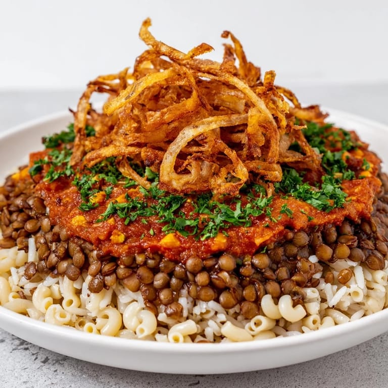 Every layer in koshari serves a purpose beyond taste. The rice provides a soft, absorbent base that soaks up sauce; the lentils add earthiness and protein; the pasta contributes a tender chew; and the crispy onions deliver that essential crunch that keeps your mouth engaged. When you nail this balance, each bite becomes an experience rather than just fuel. I once served it with undercooked onions by accident, and the dish felt flat, incomplete—which taught me that texture contrast isn't optional, it's fundamental.