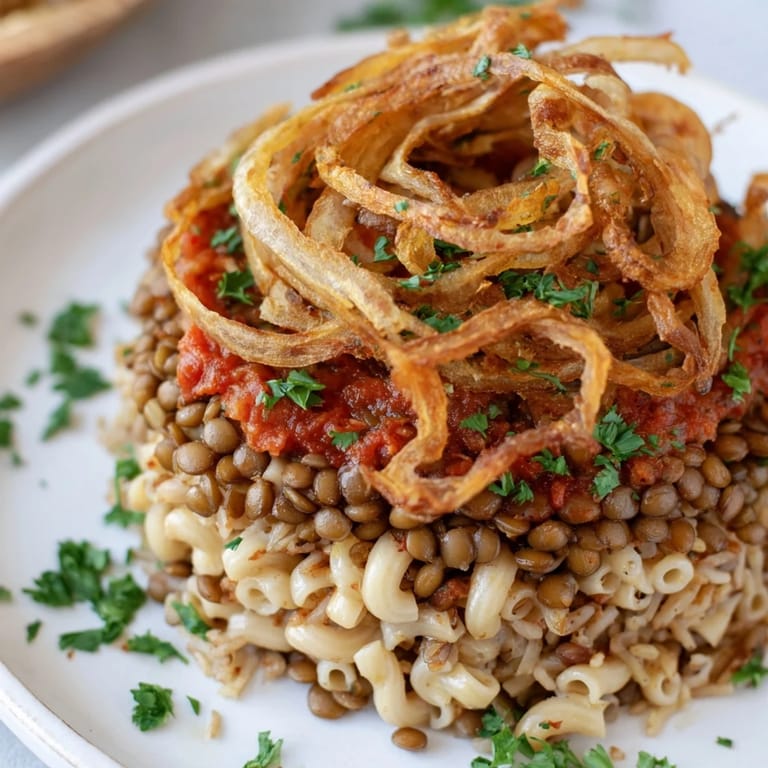 Pin This The first time I tasted koshari, I was standing at a cramped Cairo street stall, wedged between locals who moved with practiced precision through the narrow counter. The vendor layered rice, lentils, and pasta with the rhythm of someone who'd done this ten thousand times, then crowned it all with a cascade of that spiced tomato sauce and crispy onions that scattered like golden confetti. I remember the sound of those fried onions crunching between my teeth, how the warm, tangy sauce tied everything together into something far greater than its humble parts. That single bowl taught me that comfort food doesn't need fancy plating—it just needs honest ingredients and the confidence to pile them high.