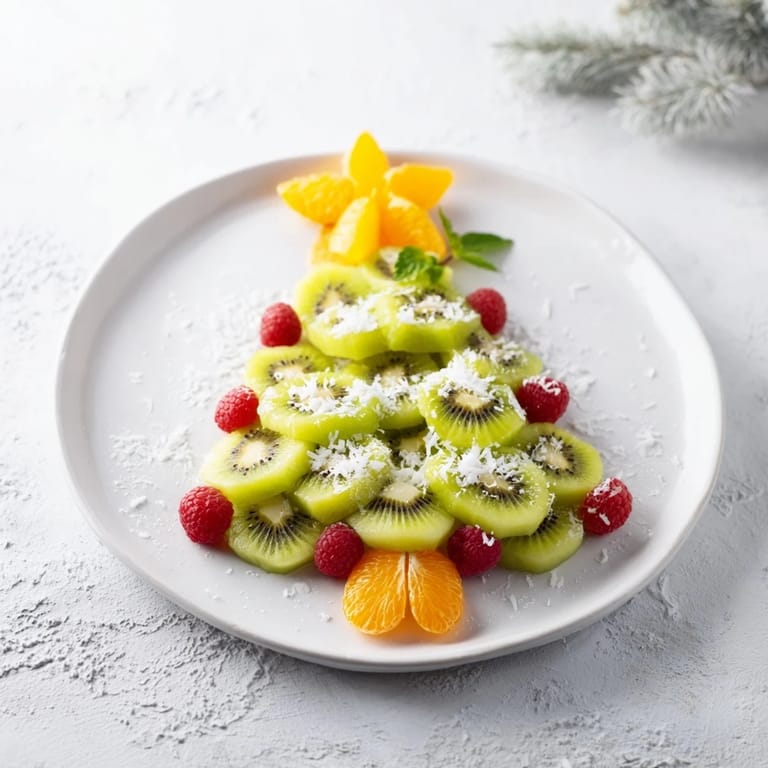 Pin This A festive and vibrant fruit platter shaped like a Christmas tree, featuring fresh kiwi slices and raspberries for a healthy, eye-catching holiday treat.